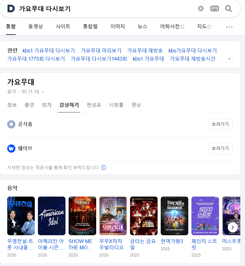비공식 가요무대 다시보기 링크가 보일 수 있는데,