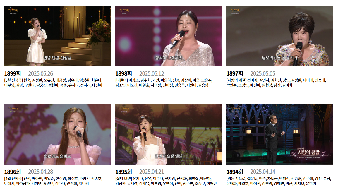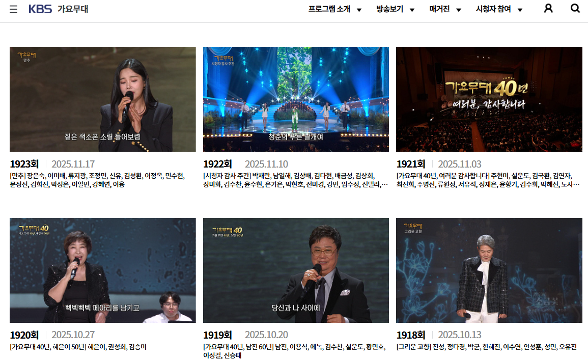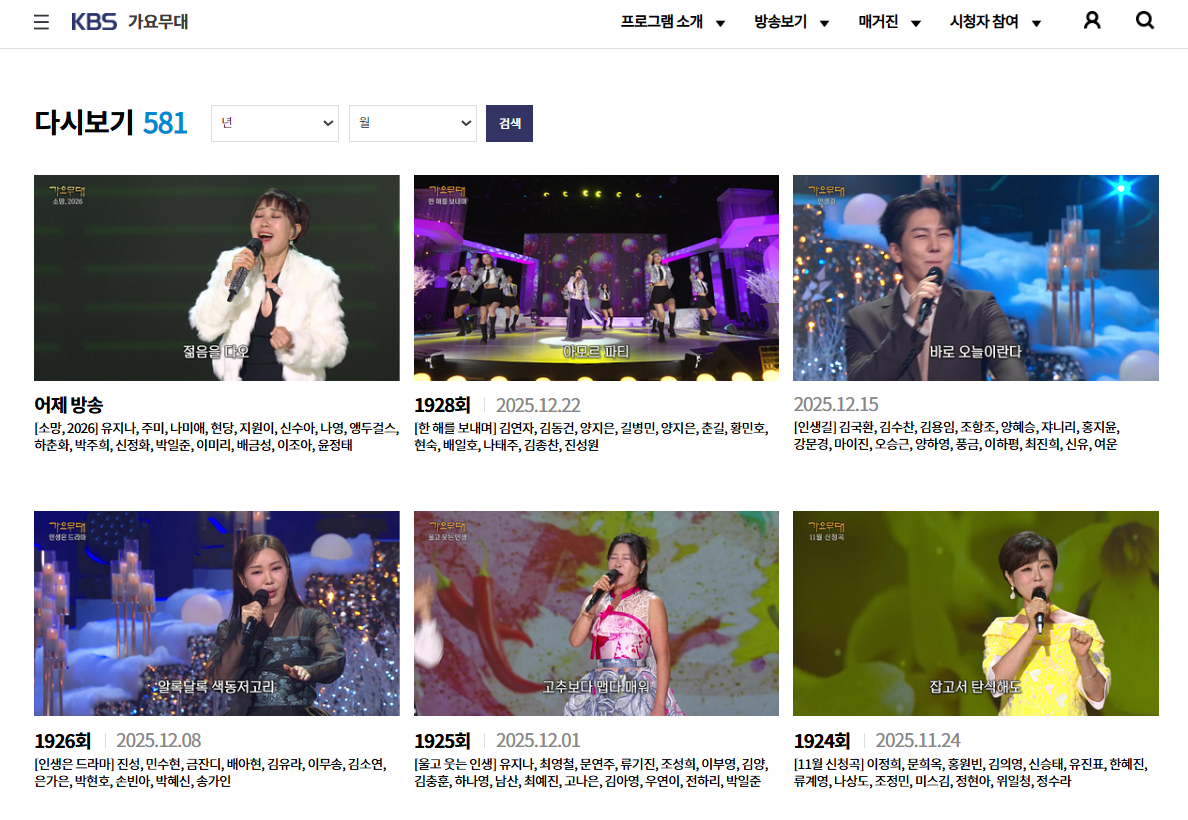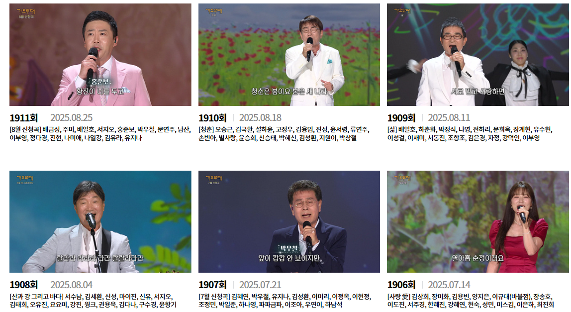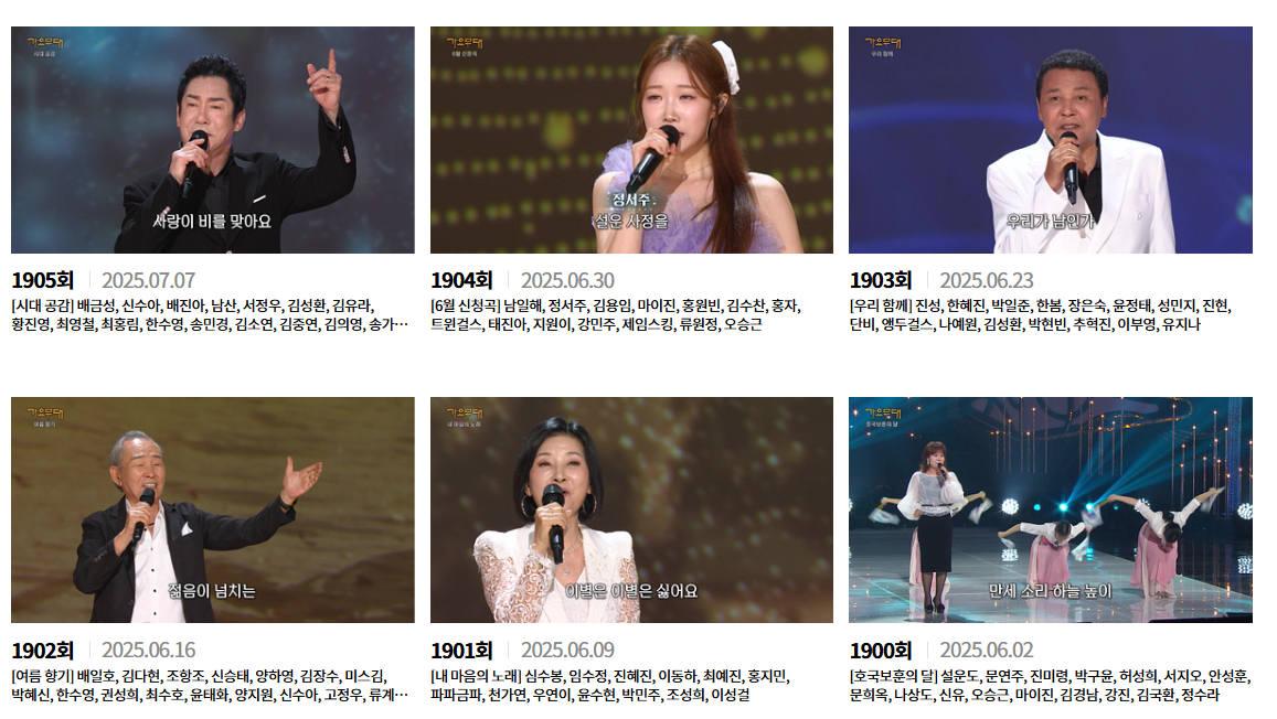 방송 시간을 놓쳤거나, 다시 보고 싶은 무대가 있을 때 가요무대 다시보기 서비스가 있습니다.