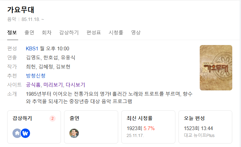 따라서 가요무대 출연진 정보는 방송 당일 가장 많이 검색되는 키워드 중 하나입니다.
