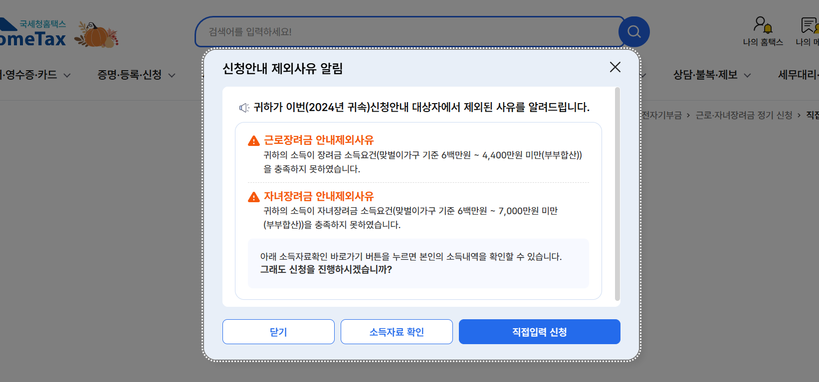 소득기준을 충족하고도 신청하지 않으면 2024년도 장려금은 받을 수 없습니다.