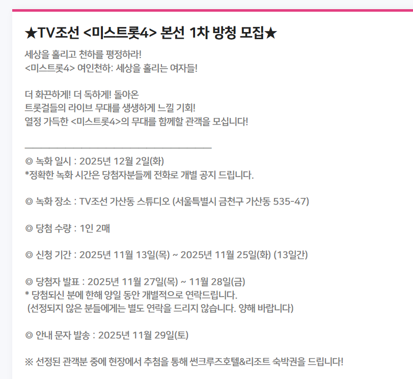 방청객 모집 미스트롯4 방청객 모집 안내 관*자 2025.11.13 세상을 홀리고 천하를 평정하라! <미스트롯4> 여인천하: 세상을 홀리는 여자들! 더 화끈하게! 더 독하게! 돌아온 트롯걸들의 라이브 무대