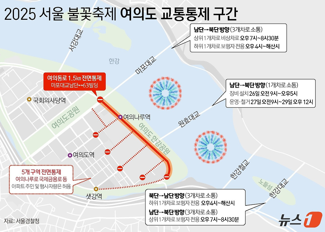 👉 오후 2시부터 밤 10시까지 여의동로 전면 통제가 시행됩니다.