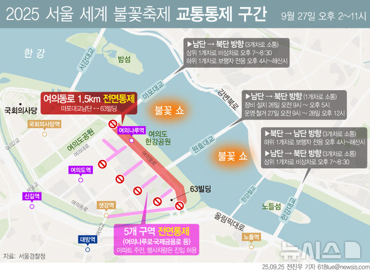 - 통제 구간: 여의동로 전면 통제, 여의나루로·국제금융로 등 탄력 통제