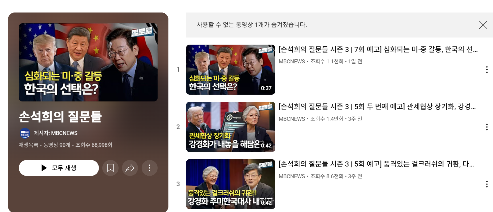 - MBC 뉴스 공식 유튜브에서 “손석희의 질문들” 주요 클립 영상 업로드