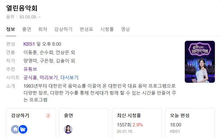 1월 25일 열린음악회 방송 일정 한눈에 정리