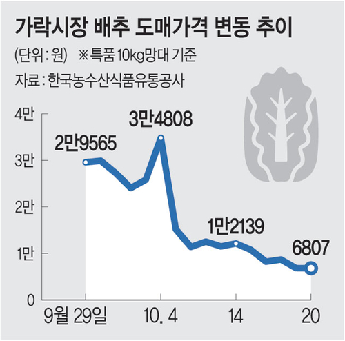 - 김장배추 가격은 1년 전보다 약 3분의 1 수준으로 떨어짐