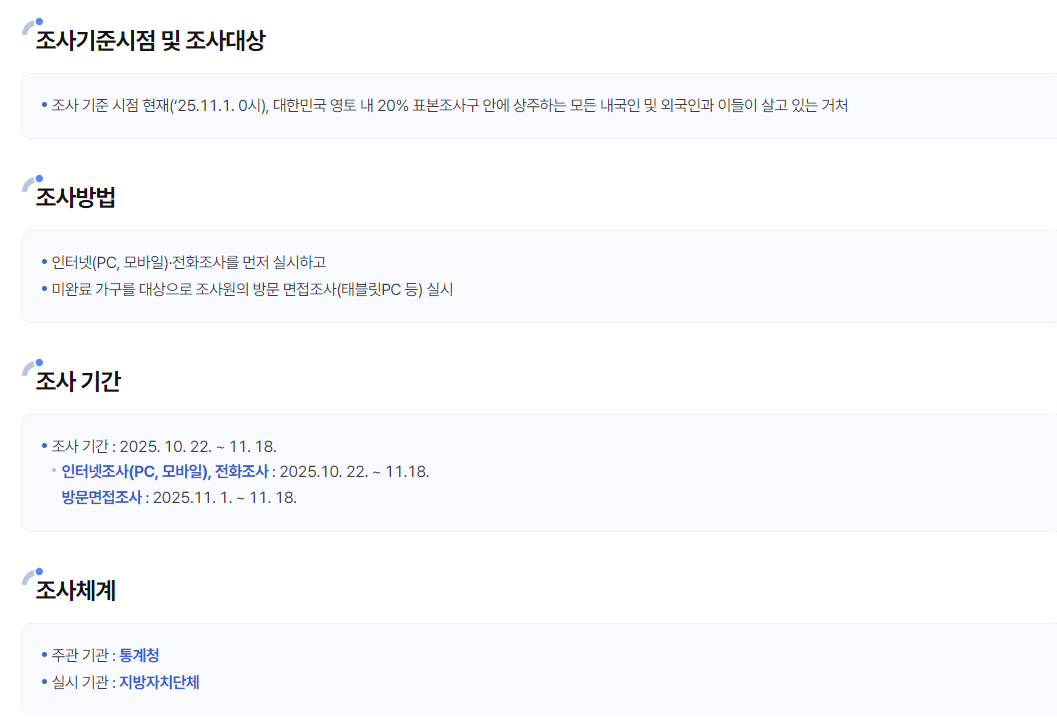 | 방문조사 | 11.01 ~ 11.18 | 조사원이 직접 방문 (태블릿 사용) | 대상 미응답 가구 중심 |