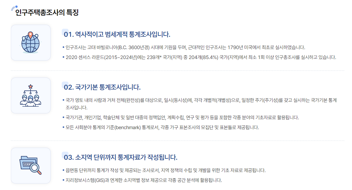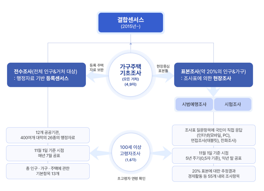대한민국의 인구 변화와 주거 현황을 파악하기 위한 국가 단위의 대규모 조사입니다.